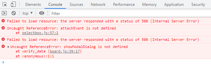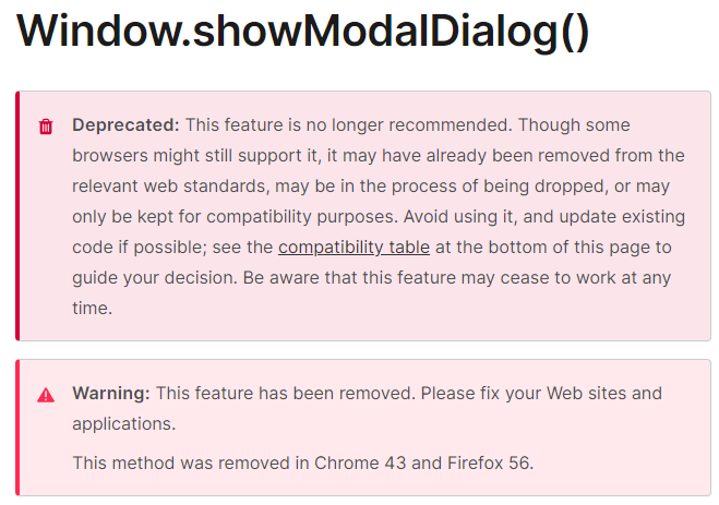특히, 가장 많은 사례는 "showModalDialog" 미지원에 따른 오류로, IE4 이후에 도입되어 호환성을 위해서 타 브라우저에서도 사용되었다가, 부모자식창의 통신방식, 모바일 호환성, 보안 등 여러가지 이유로 최신 브라우저에서는 지원을 종류하고 있다.