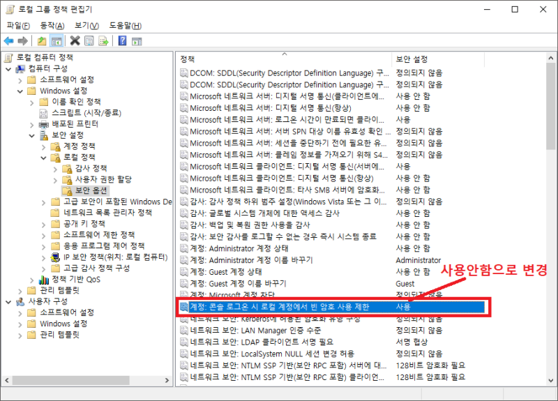 이 오류에 대한 Microsoft에서 제공한 해결방법은 '로컬 그룹정책'에서 '계정'파트의 '로그인 암호사용'부분을 "사용"에서 "사용안함"으로 변경하는 것이다.