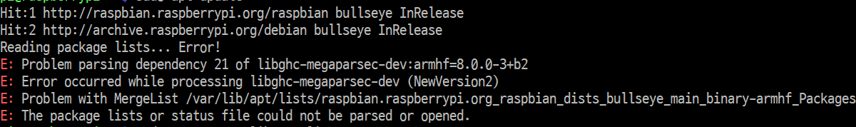 Raspberry Pi의 운영체제 Linux 배포판(Raspberry Pi for Desktop 또는 라즈비안)을 설치후 시스템 라이브러리 업데이트를 위해 아래의 명령을 실행했는데 패키지 리스트 오류가 발생하였다.